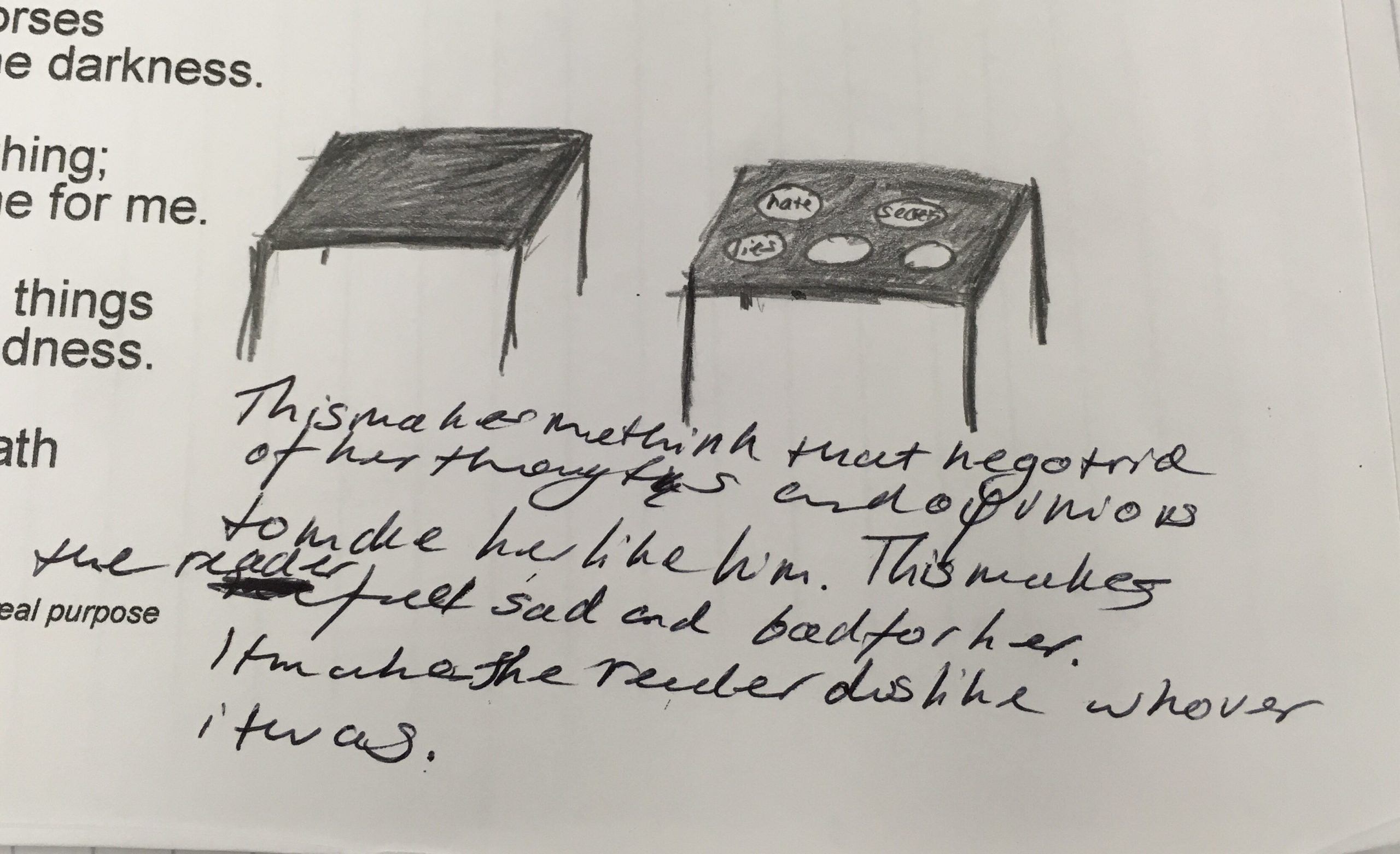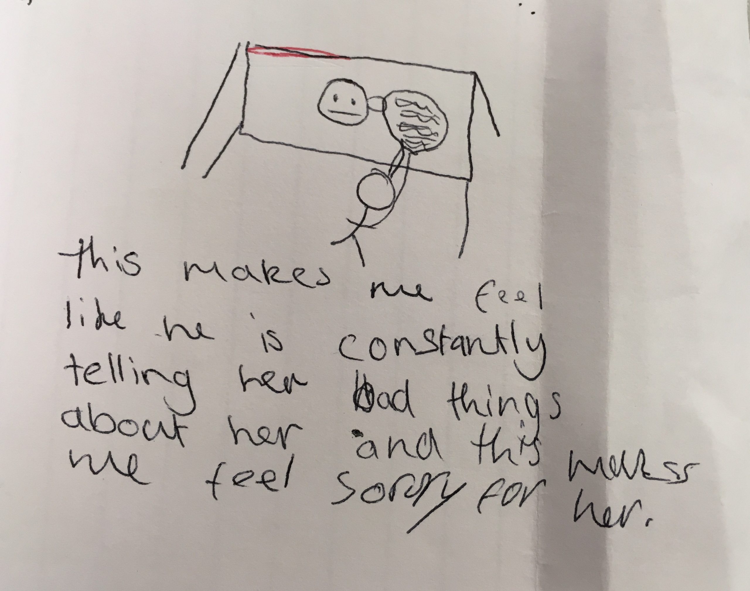 This lesson was better than any PSHE lesson we could have done about relationships and abusive situations. And the boys were as active in the discussion as the girls. Every single teenager was alert to the poem. It was a special lesson for me and the thought of it has kept me going this year, through all the exhaustion of a demanding and sometimes difficult job. Here’s a selection of the drawings and explanations that really moved me.