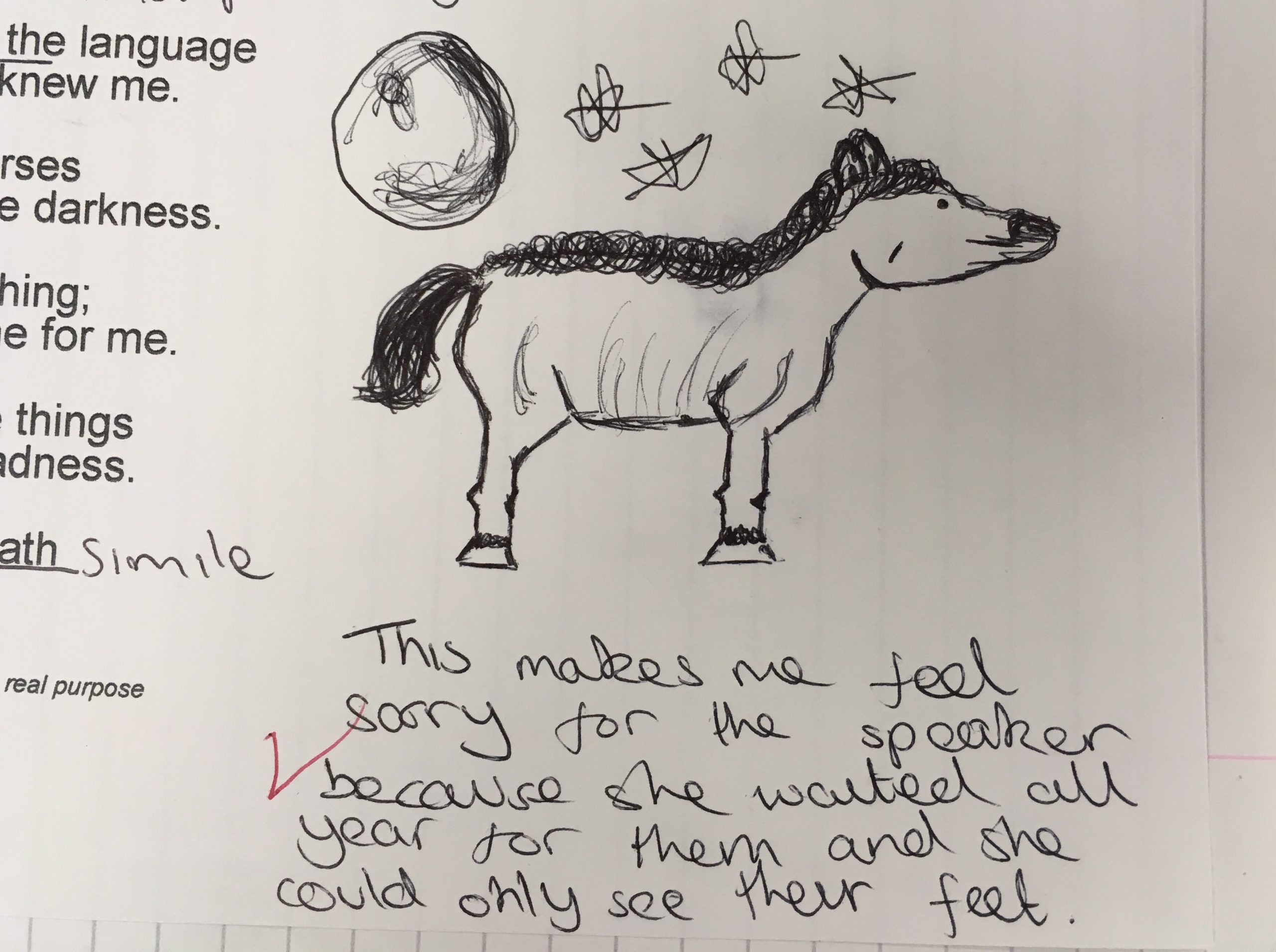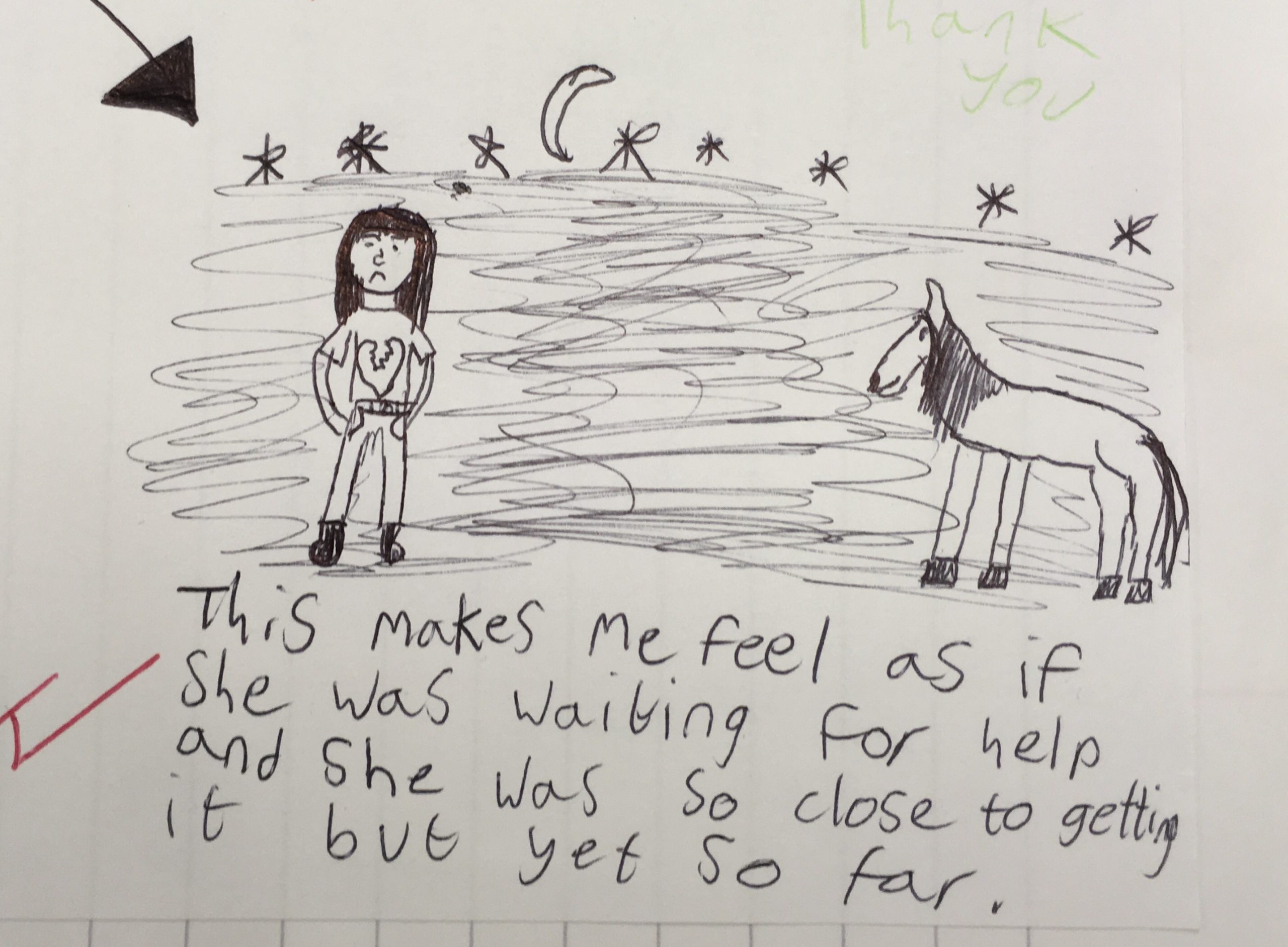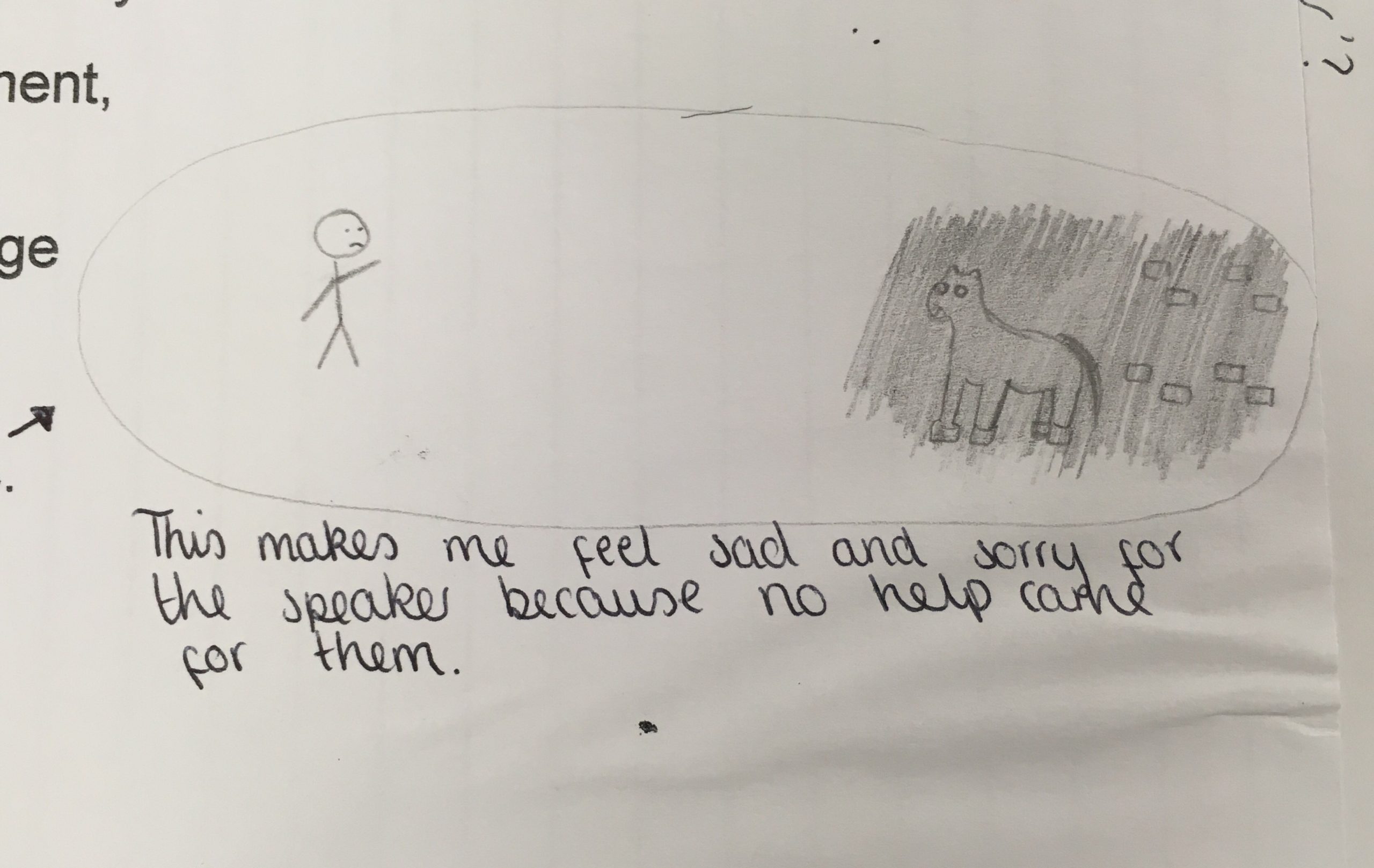 I found the interpretations of my poem really moving and I thought the students were very perceptive. I also found it interesting how they managed to create different narratives to go alongside the poem – and I love the drawings!